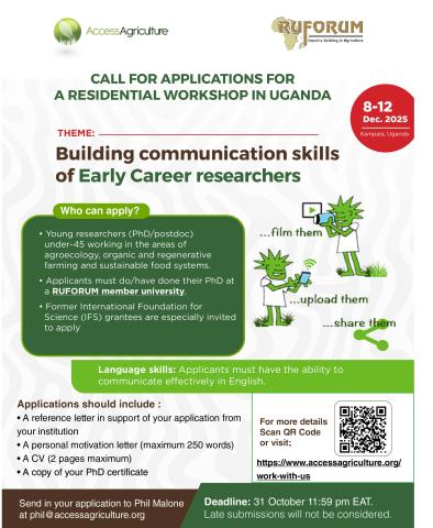 Access Agriculture, in partnership with RUFORUM, will conduct two residential workshops (one each for Anglophone and Francophone participants) designed for selected early-career researchers who are affiliated to institutions of higher learning or national research institutes in sub-Saharan Africa.